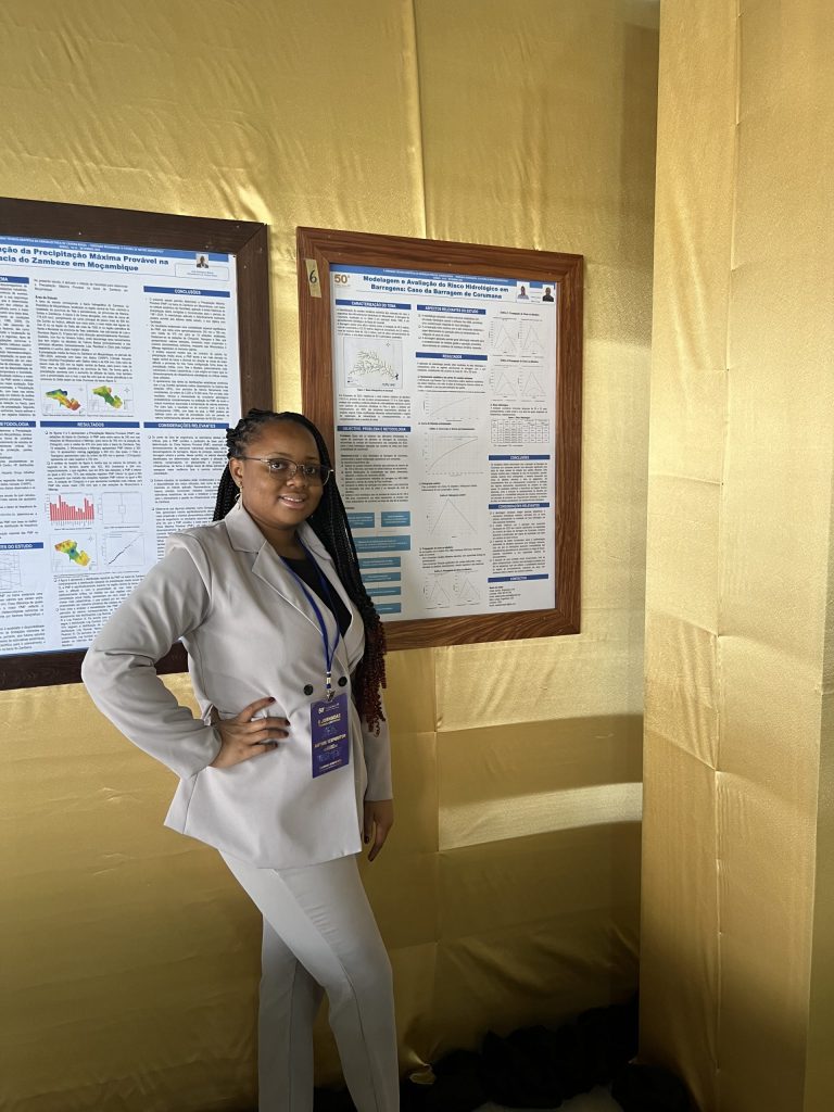 Neste contexto, a Eng.ª Cleide apresentou o estudo “Modelagem e Avaliação do Risco Hidrológico em Barragens: Caso da Barragem de Corumana”, desenvolvido em coautoria com o Eng. Mário Langa. O trabalho avaliou os riscos associados a cheias na Barragem de Corumana após a entrada em funcionamento das comportas, em 2022, combinando o ajustamento estatístico das cheias com a simulação hidrológica.